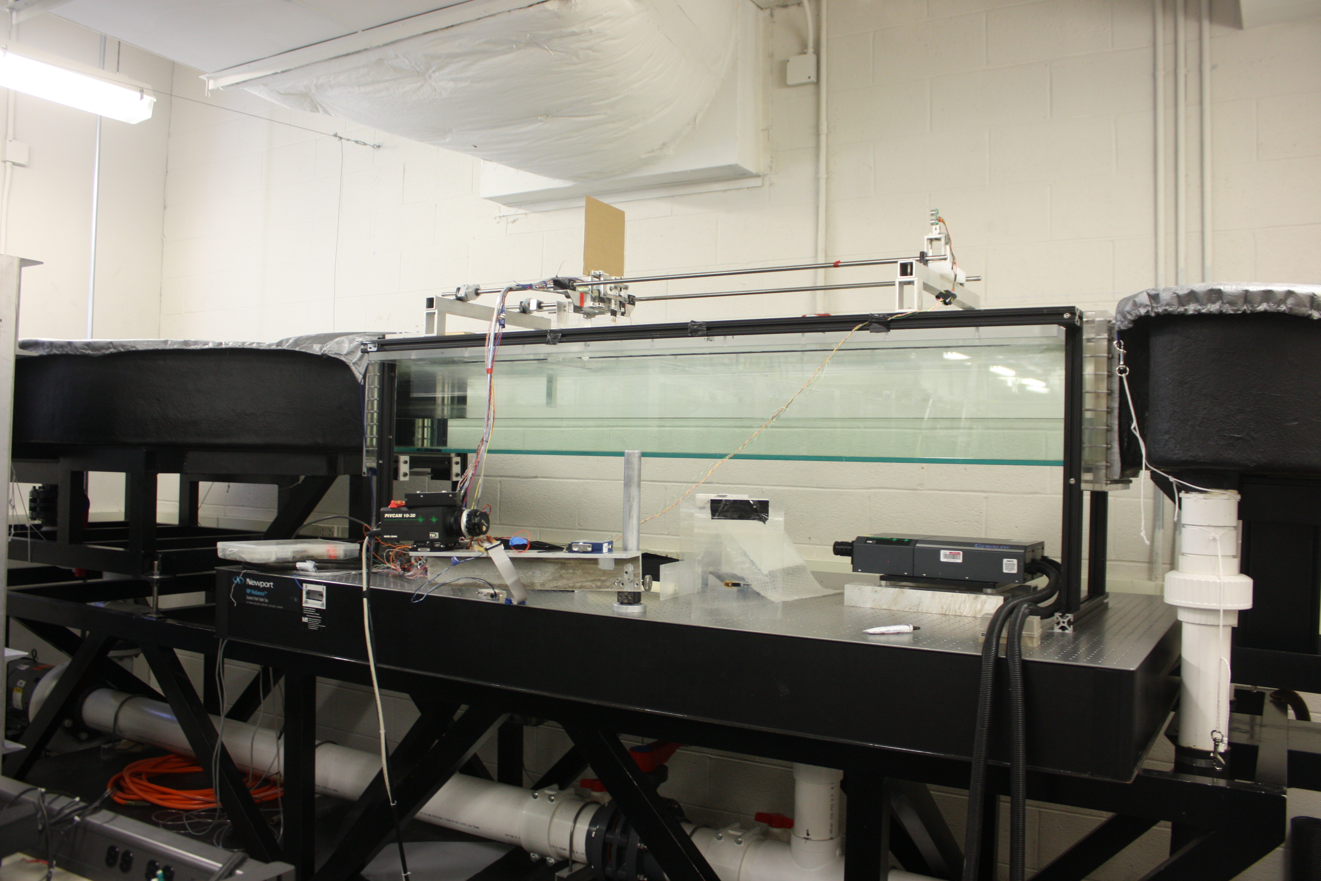 Specially constructed for PIV measurements. The test section has sides and bottom walls made of glass, an optical table as a base, vibration-damping supports and aluminum railings to facilitate the mounting of optical and experimental equipment.