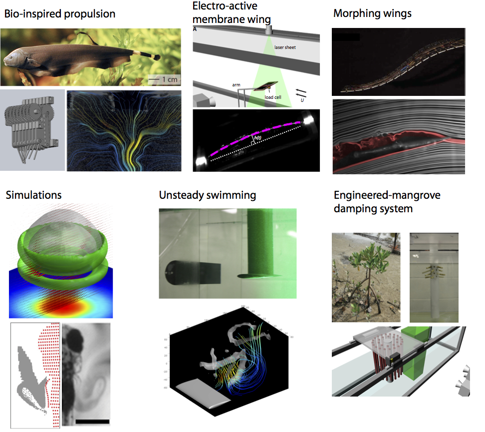 Our research focus in the study of biological propulsion, biomimetics and flow control. Swimming and flying animals have a remarkable ability to navigate through complex environments. As they propel themselves, they interact with the surrounding fluid medium. This fluid-animal interaction during locomotion is a fundamental factor in how animals actuate their muscles as well as how they have evolved. In order to incorporate biological-based designs into the next generation of underwater or air vehicles, it is crucial to understand the role of fluid dynamics in animal locomotion. Furthermore, the results of this work will help us to understand the interconnection between fluid dynamics and the development of the morphology, sensory system and motor control of animals.