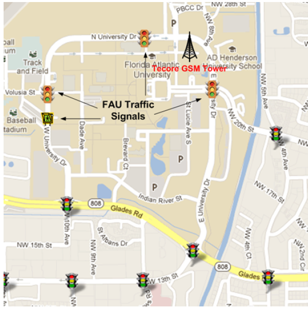 The hardware development has been completed along with the implementation of the IEEE 802.11p and the WAVE standards (1609.4, 1609.3, 1609.2). A variety of VANET applications have been tested in a network of roads within FAU Boca Raton Campus. The following image shows the road network of FAU campus that serves as a test bed.